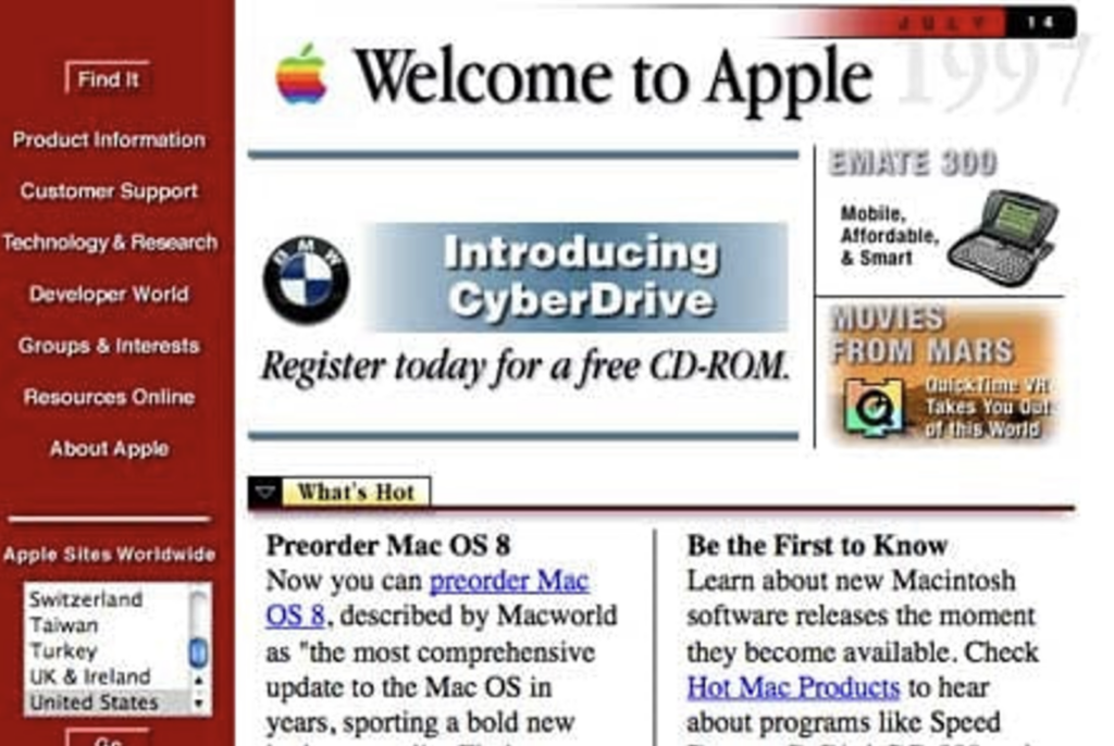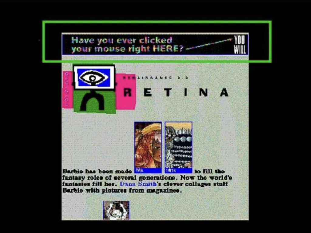While many sites became overcrowded with ads during the 90s, Hotwire, now known as Wired, did a nice job of adding the world’s first banner ad into their site’s header. The first banner ad was purchased by technology company AT&T on HotWired.com in 1994. This ad was clicked on by 44% of people who saw it and it created an undeniable buzz amongst advertisers and consumers alike. At the same time, this page had very little text, but more design elements to engage the users.